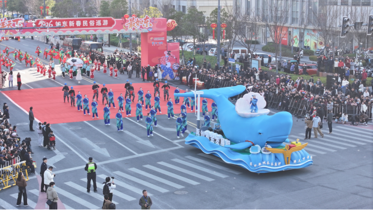 栟茶镇方阵融合古镇烟火、汉服快闪、青春花鼓、浒澪花鼓等情景与非遗元素,展现千年古韵与民俗特色;岔河镇方阵以“喜乐岔河·阳光少年”为主题,融合舞蹈、足球及苏超元素开展联动表演,尽显教育特色与少年活力;长沙镇方阵以“港渔共生”LNG船造型花车为核心,彰显海港产业与渔乡风情;大豫镇方阵以“花韵扇舞 蹴鞠贺春”为主题,依次呈现祈福、贺春、呈祥表演……16个镇(区、街道)特色方阵汇聚如东全域非遗特色与产业风采,从不同侧面勾勒出如东大地的多元魅力,让沿街群众大饱眼福。“各个乡镇都展现了自己独有的特色,比如我们洋口港的抹香鲸就是独一无二的!希望未来我们如东的巡游活动越办越好、越来越棒!”如东市民左冰心语气中难掩自豪。