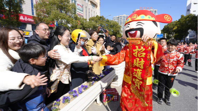 两个小时的巡游表演里,最具人气的环节当属“神仙”巡游——笑眯眯的“土地公”、手捧金元宝的“财神”一边前行,一边与沿途人群击掌互动,送上最真挚的安康富贵祈愿。