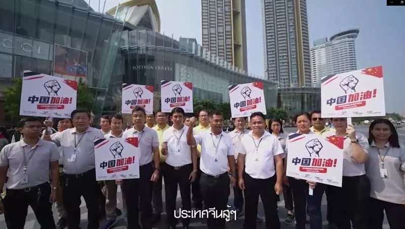疫情初期,新冠病毒肆虐中华大地之时,泰国政府、泰国人民以及在泰华人为中国加油打气、捐款捐物,民众聚集在商场广场前为中国助力,曼谷街边配有加油词的
