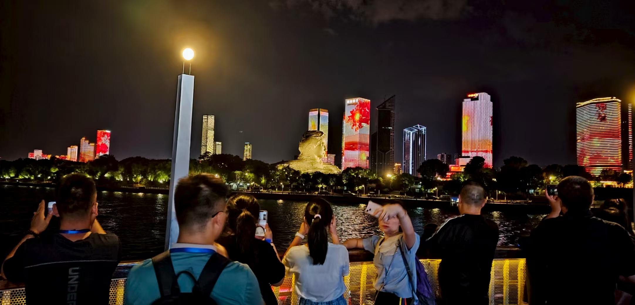 当夜幕降临,华媒代表乘轮渡驶入流光溢彩的湘江。两岸CBD璀璨如星河,以天心阁为幕布的"魁星光影秀"点亮夜空,快门声此起彼伏!"橘子洲头太美,长沙的红色基因是最大特色!"阿根廷《华人在线》社长吴晓榕一语道出长沙文旅精髓——岳麓山、秋收起义旧址...这座革命热土,正以火红底色吸引全球目光!
